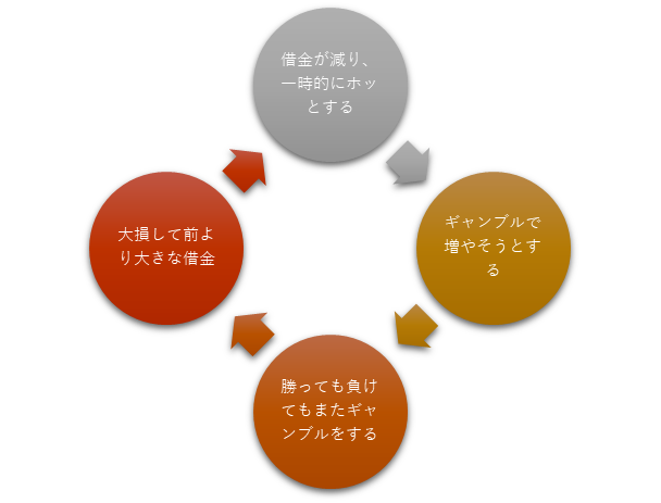 王道の借金コースです。1人で悩んでいるとほぼ必ず上記のように前よりも大きな借金に追われることになり、もし家族が肩代わりしてくれてもまた借金を繰り返します。