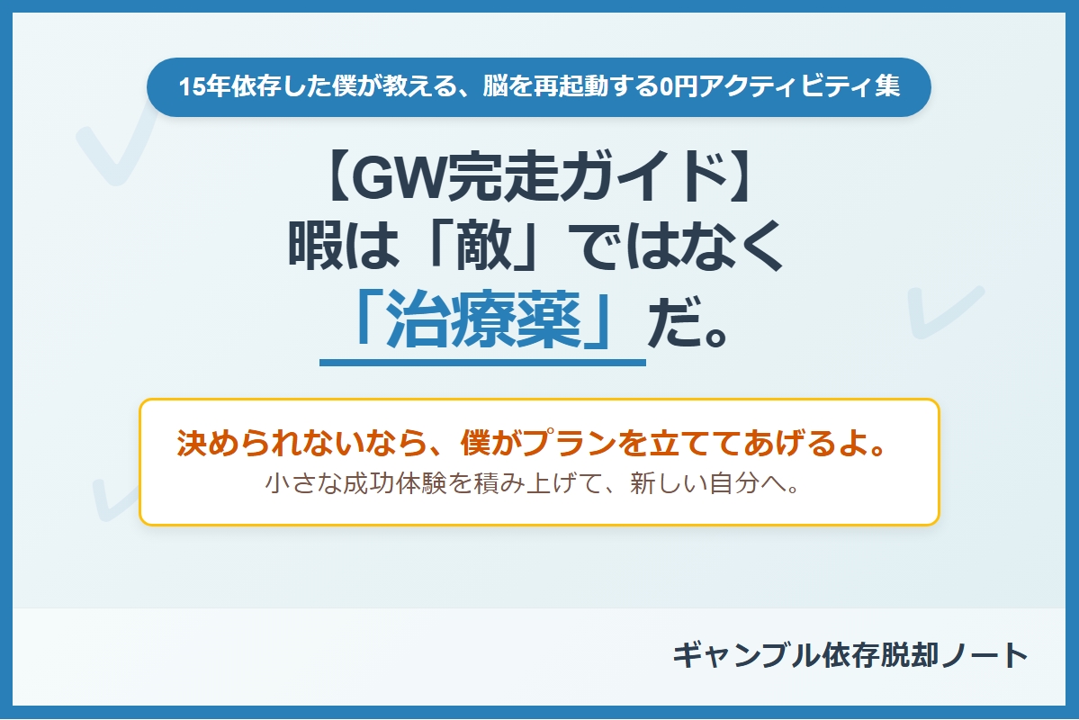 依存症の脳にとって、暇は最大の毒にもなりますが、正しく使えば「脳の報酬系を書き換える最強の薬」になります。ギャンブルで1万円を数分で溶かす虚しさよりも、自分の手と時間を使って「小さな達成感」を積み上げる喜びを、この連休で取り戻しましょう。
